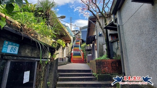 續從祈堂路86號民宅旁彩虹階梯爬上,金瓜石祈堂老街,已有百年歷史,寧靜懷舊,近年來因祈堂老街彩虹階梯而成網紅景點。