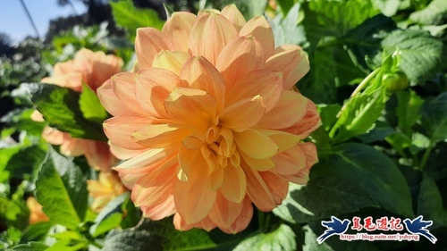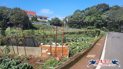 菜園內盛開數朵金黃色大朵黃花,看起來應似大麗花(大理菊),複瓣花朵花形大而華麗,一派雍容華貴之姿。賞花畢,續前行,