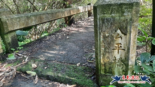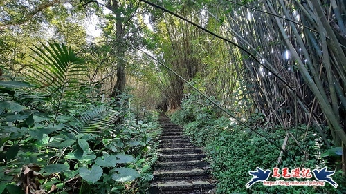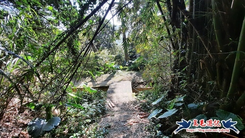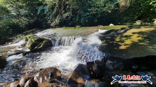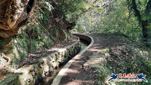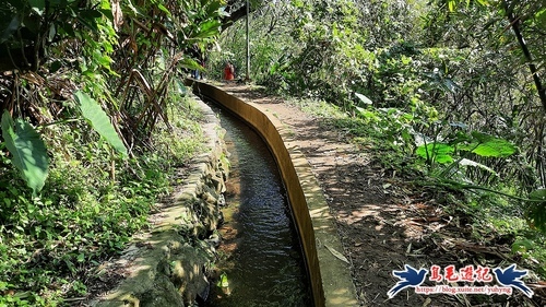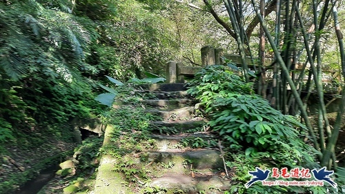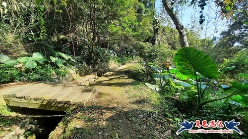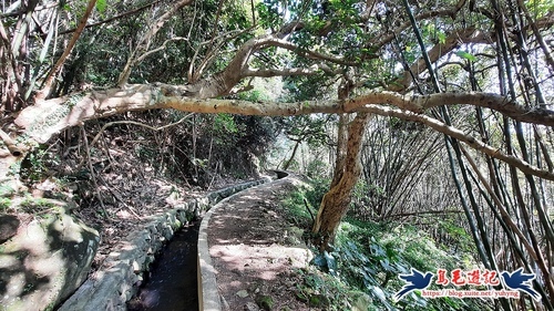 金合興圳1K+000過來約12分已至公平橋,旁有菁礐溪水圳口,過橋後觀賞一下石盤水瀑美景,然後石階陡上竹林步道,