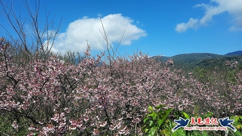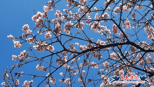 花~花~花~放眼望去,眼睛裡看到的都是淡粉紅色寒櫻花。寒櫻粉嫩,迎風招展,遠山迷濛映照,讓人陶醉在這粉紅寒櫻世界。