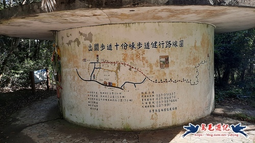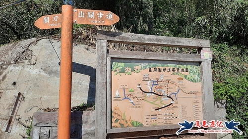 出關古道十分崠步道入口就在薑麻園瞭望台旁,步道口有健行路線圖,依照折返點可區分為:近程步道去回約1公里/1小時、