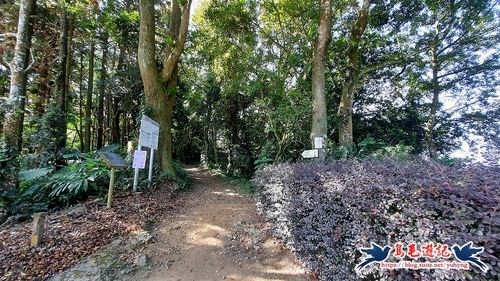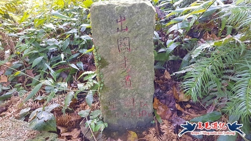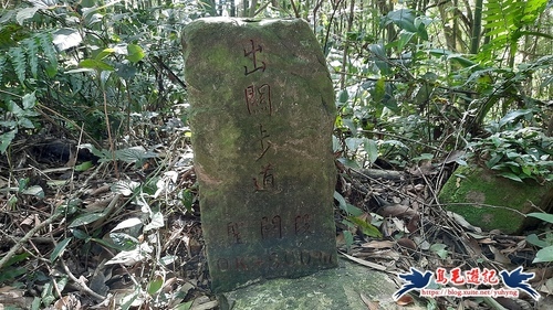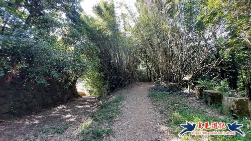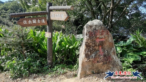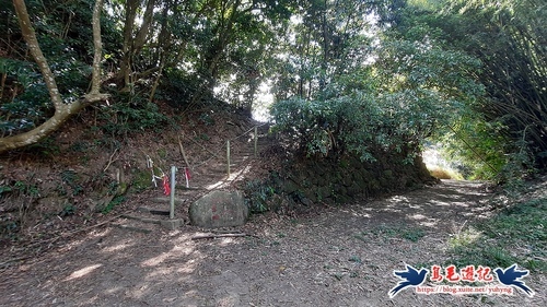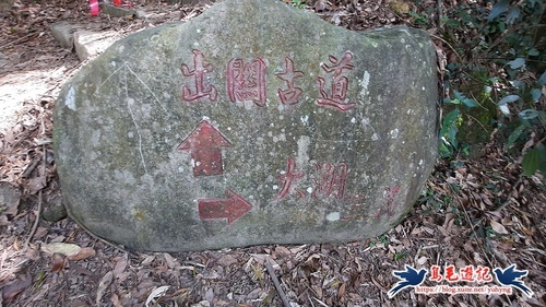 續前行從薑麻園旁邊坡走下來步入林間,階梯旁有巨石指標,左後方向是往三義的產道,關刀山自右前方竹林古道進入,