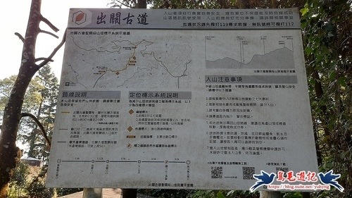 關刀山登山步道入口處有幾面解說牌,據述:出關古道總長6.5公里,聖衡宮至十分崠4公里,130線至關刀山為2585公尺。