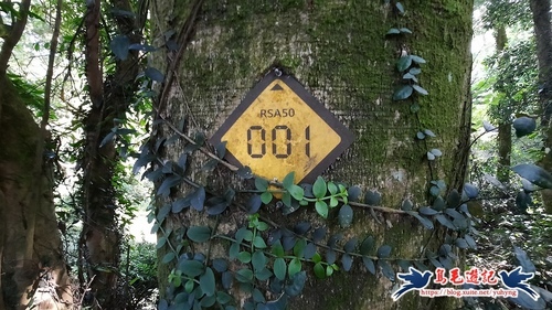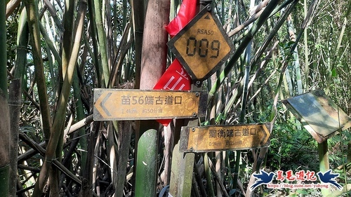 此處有樟之細路「RSA50/009」黃色反光牌,依指標距苗56端古道口1.4K/約50分,聖衡端古道口0.9K/約35分,單程約走1/3了,
