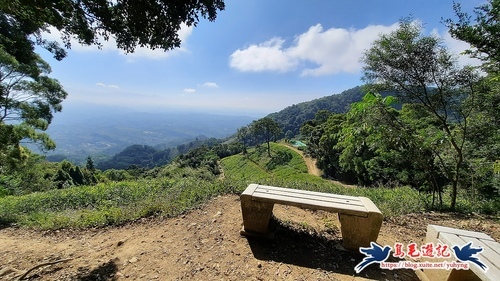 過0K+500M石碑前行不久轉為上坡,繞過山坡間的薑麻園,綠野青山好風景,藍天白雲好天氣,也可稍坐長椅暫歇賞景一番,