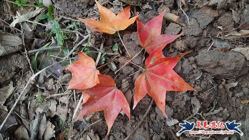 山稜空曠處可遠眺山巒疊翠,步道上掉落數片楓葉已紅,