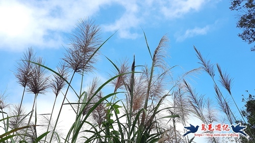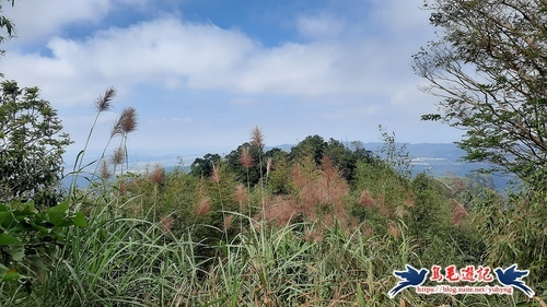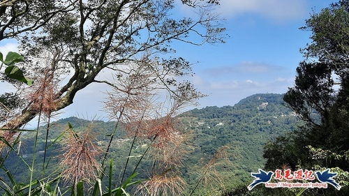 山稜上高大的芒花在風中搖曳,伴隨著吾人獨行的腳步,再一小段石階陡上山稜,空曠處回望來時方向,可眺望山腰聖衡宮,