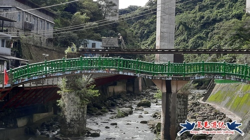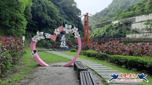 搭乘666公車到達雙溪口下車,石碇淡蘭吊橋前有一粉紅心形地景意象,也成了網紅打卡熱點,天空飄著毛毛雨,漫步走過吊橋,