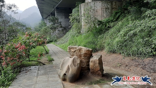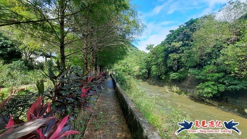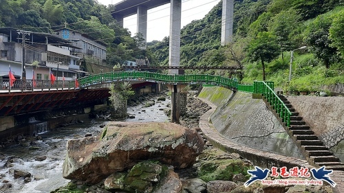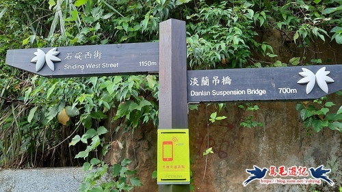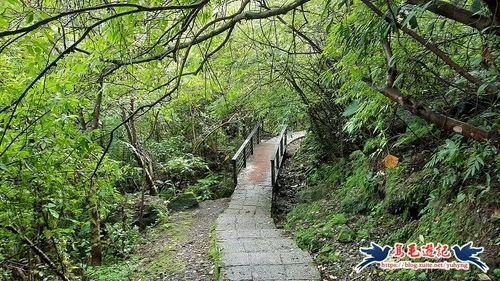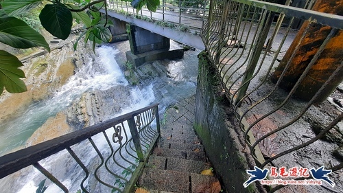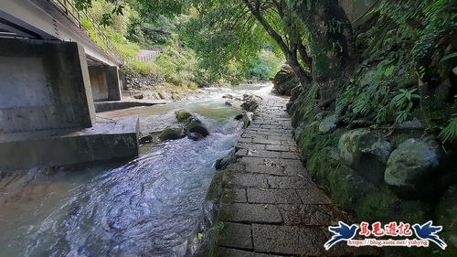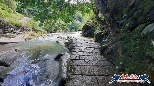 過橋後沿著高架橋下溪畔步道前進,約700公尺後續往石碇西街指標方向走,再從「古道尋幽」石碑進入,然後石階緩下,
