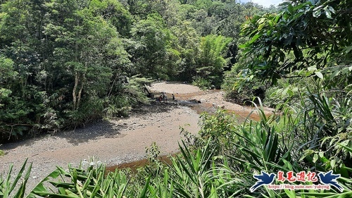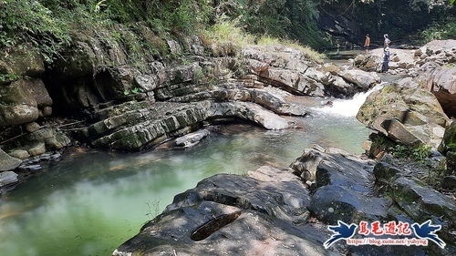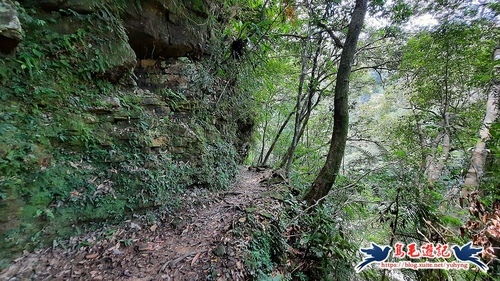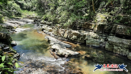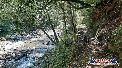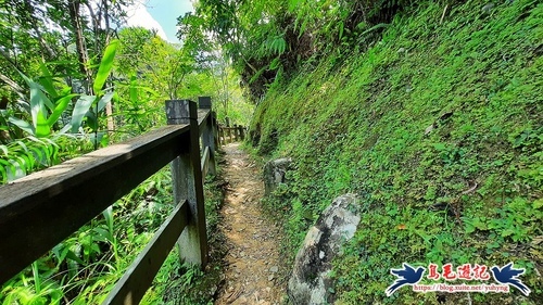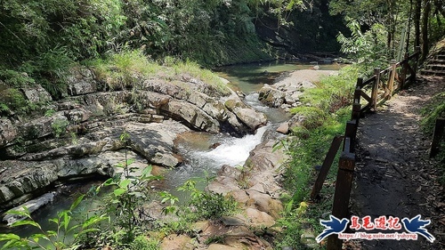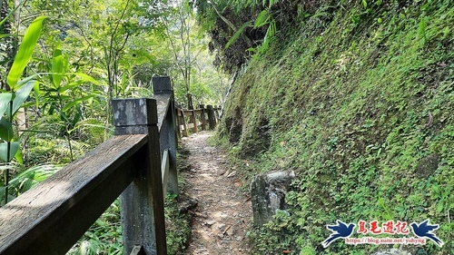 步道沿著溪畔山腰路而行,一路上蟬鳴鳥叫相伴,水聲潺潺和徐徐涼風,走起來就是舒適宜人,