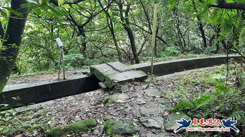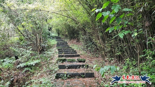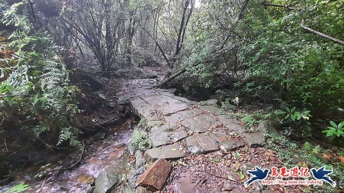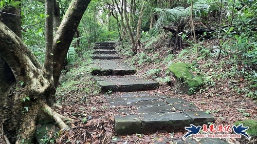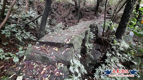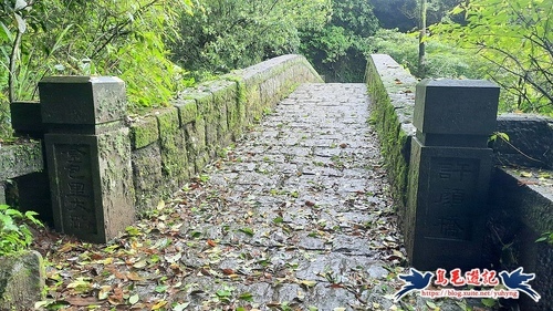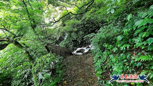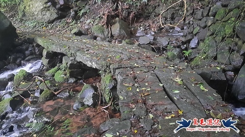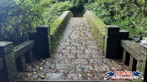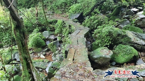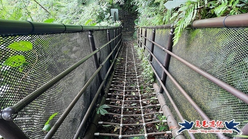石板橋越溪而過續腰繞,過橫向水圳後階梯下坡,續有鋼索網梯陡下,