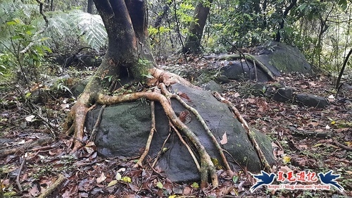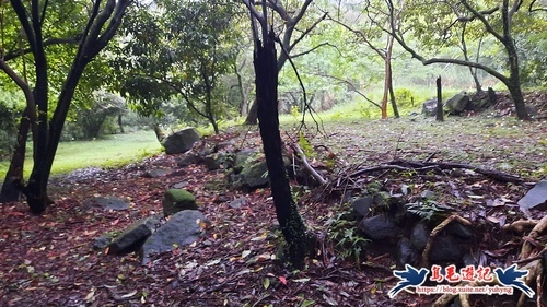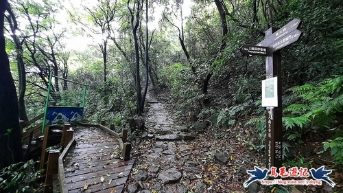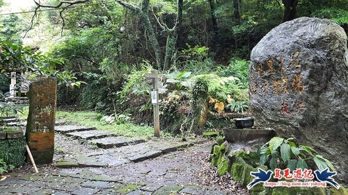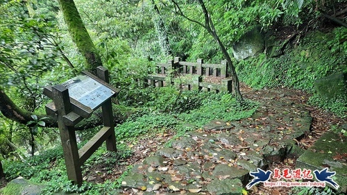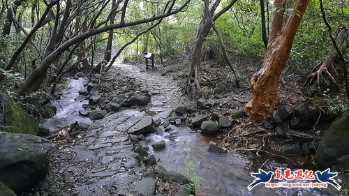 經大石公解說牌,再往下走轉入樹林間是較平緩石塊鋪設步道,此段大致沿溪而行可欣賞溪瀑水聲及美景,路旁有小土地公廟,