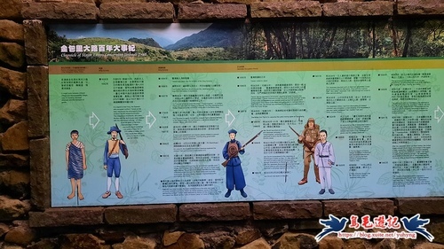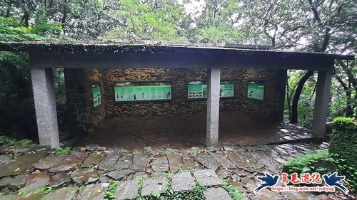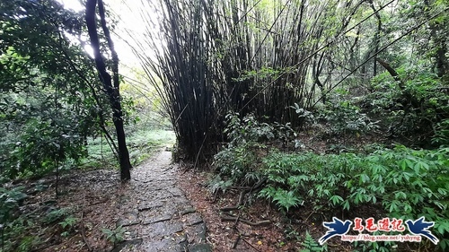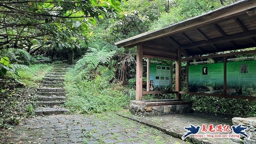 接下來步道時有起落,終從桂竹林間石階長緩下坡,八煙登山口處旁有木造涼亭,內部掛有文史解說牌,