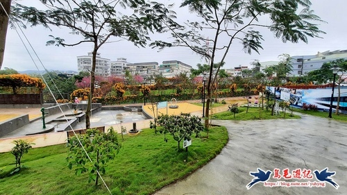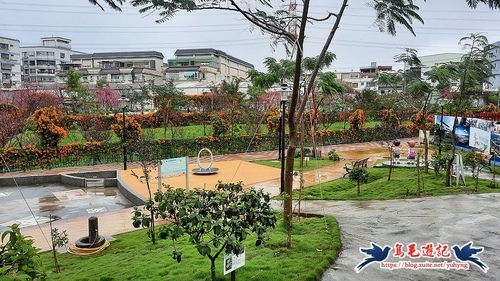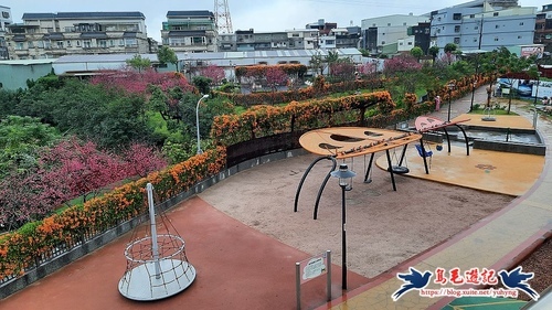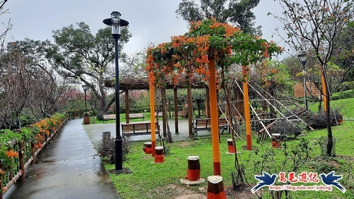 公園後方坡地還有一小片櫻花林、可愛大小熊貓、炮仗花涼亭及遊樂設施,
