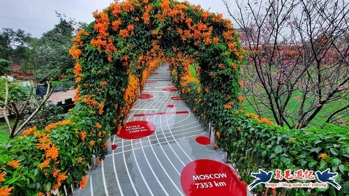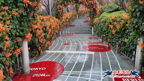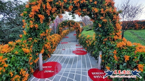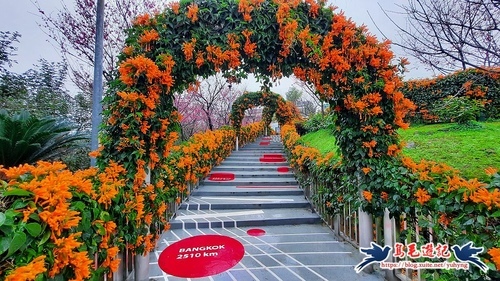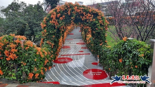 炮仗花海拱門隧道的步道階梯上,標示著紅底白字圓形英文地名+里程,是鶯歌與世界的距離。