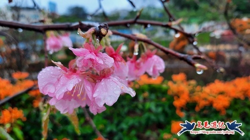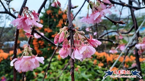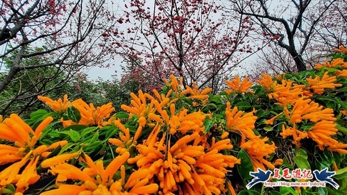 目前山櫻花約只開花五成左右,預計2月下旬花況更佳,屆時炮仗花的金黃,加上櫻花的桃紅,彼此黃紅爭艷應該就更美了...