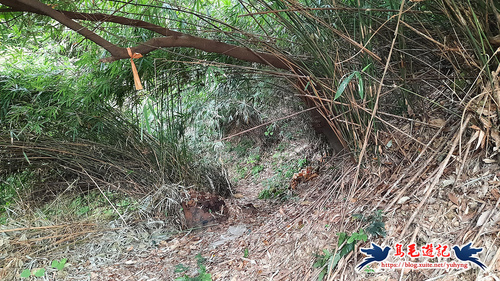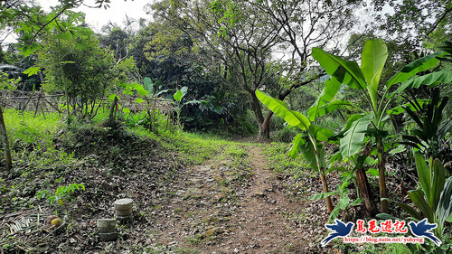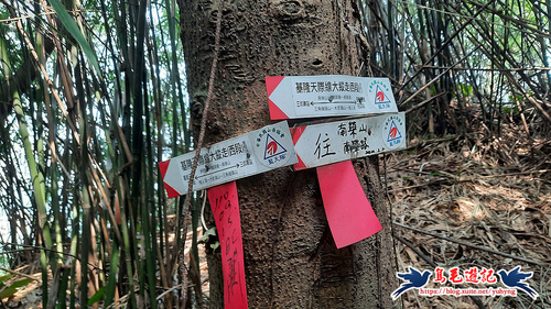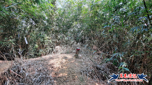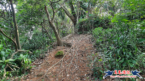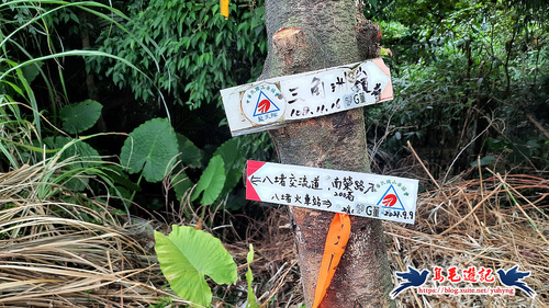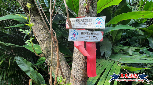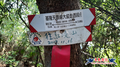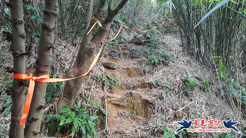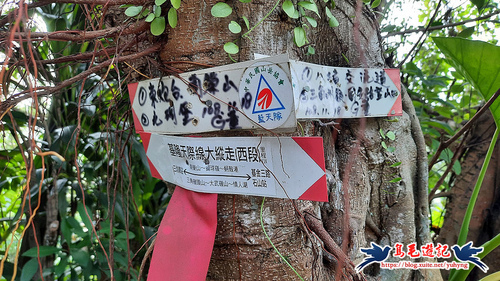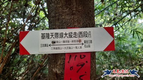 返回廣場涼亭處,不走原路,左前方還有一條土石路進入直行,至叉路,樹幹上有藍天隊「基隆天際線大縱走(西段)」指標,