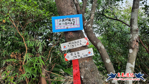 自護欄外登山口上來,約14分抵達三角洲嶺山,海拔118公尺,隆起的小高地上有台灣省政府圖根補點基石,
