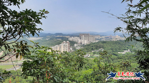 山頂視野不錯,暫歇賞景一下,然後續行竹林雅徑,左右交擁似綠色隧道般,再往上爬,便接上橫向的水泥路稜線步道,
