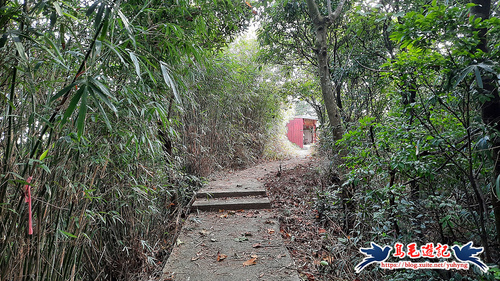 依指標取右往三角洲嶺北峰方向,可見前方不遠的紅色鐵皮屋(濟公廟),廟後有台灣省政府圖根補點基石,山頂視野佳,