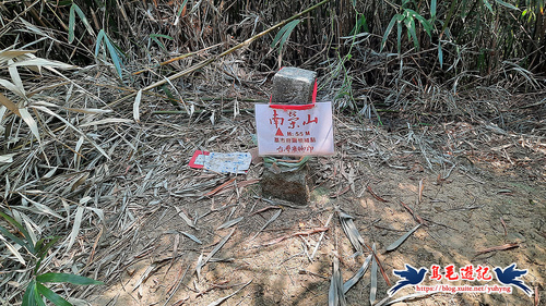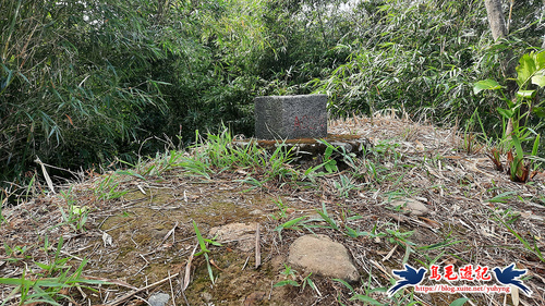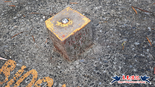 一路下坡,2-3分鐘叉路轉從左後方上來,寬大竹林路5-60公尺爬上來,竹林間有南榮山基府圖根補點基石,海拔55公尺,