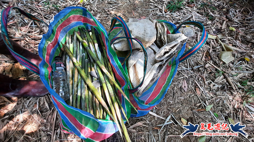提袋內有現採的竹筍子(未去皮),竹林內有人正在採筍,問道:「這什麼筍?可吃嗎?」他說:「怕麻筍呀~比箭筍還好吃!」