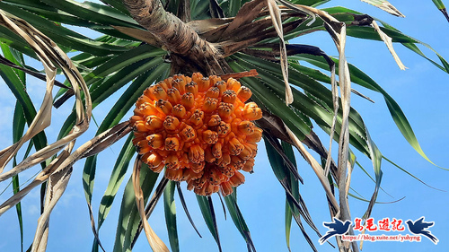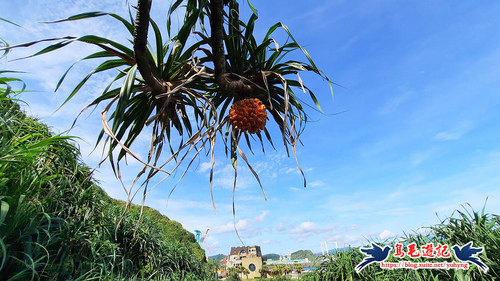 濱海步道上,抬頭一看,藍天下金黃誘人的碩大果實閃耀著光芒,這可不是「鳳梨」喔!這是野生的林投果,又名「海波蘿」,