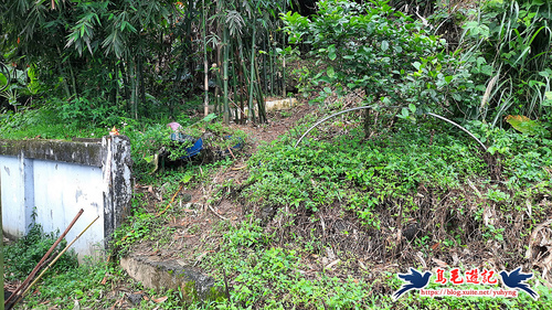在八堵水源路15號哲X汽車修理廠對面水泥圍牆旁(基隆市路燈編號電桿72046)駁坎邊坡爬上,過竹林間不遠有荒廢的階梯步道,