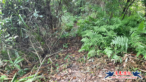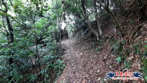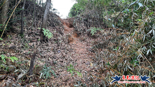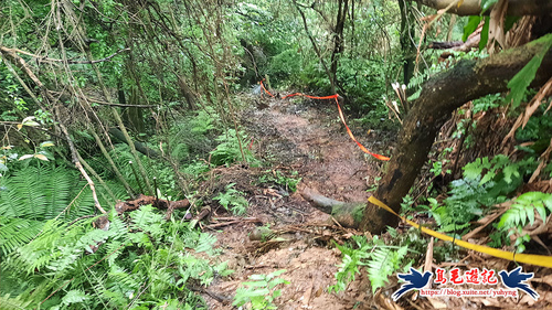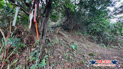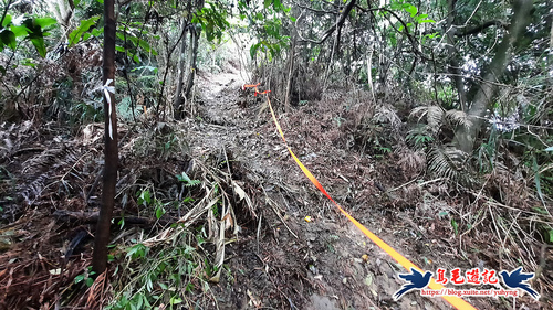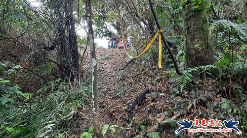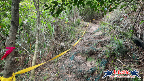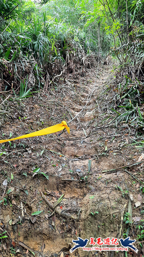 從荒廢的階梯步道上來,開始原始登山泥土路,樹上繫滿了登山條,砍通之後路徑很清楚,架有繩索輔助攀爬很快就到電塔了,