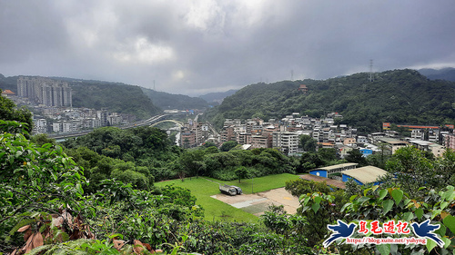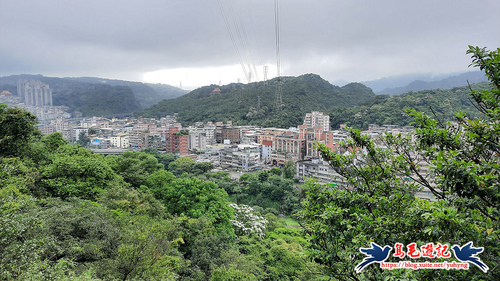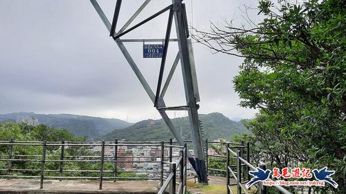 至第三座台電「八堵-茄苳-深澳臨-光明線004號」電塔,從缺口處登基座平台,憑欄俯瞰八堵暖暖一帶,有維修梯可續下步道,