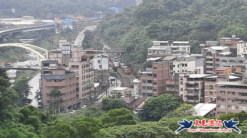 第一處電塔後路徑平緩好走,山坡間空曠處可見八堵地區基隆河兩岸景色,河岸也有北迴鐵路列車南來北往奔馳的一幕,