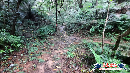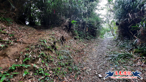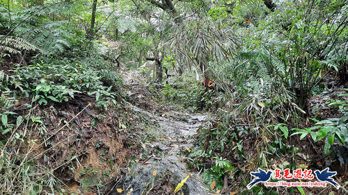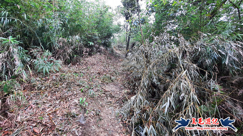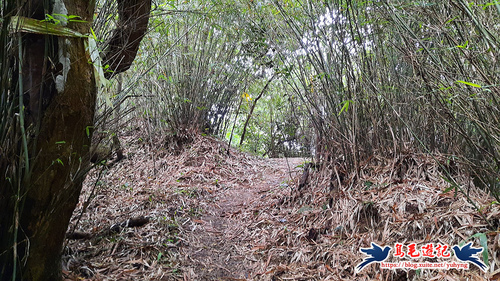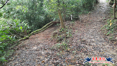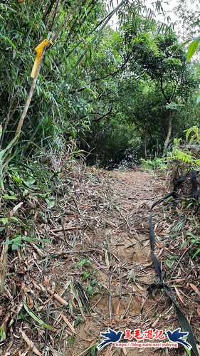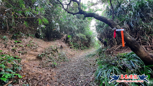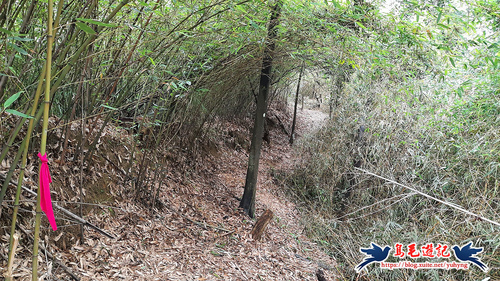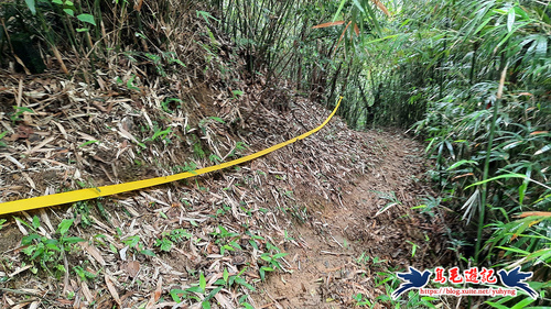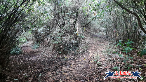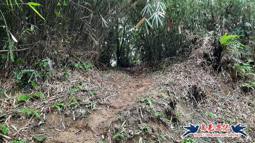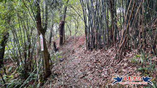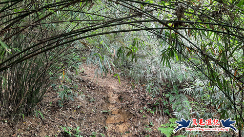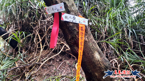 續竹林隧道前行,接下來有Y形叉路,無指標,右路繫有登山條,進入,再往前第2個Y形叉路,樹幹有指標,左路往三疊山,