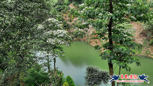 一彎翠湖,是那般琥珀色的翠綠,盪漾著無限的春水綠意,山谷之間傳來悅耳的蛙鳴鳥叫聲,隨風吹起一場桐花雨了...