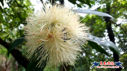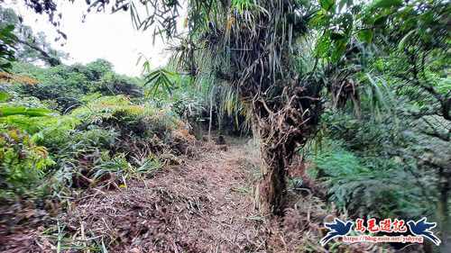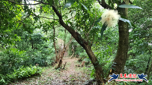 返主線,續前行,山坡丘陵間竹林路砍通好走,細雨朦朧,轉入樹林間,沿途有「香果」(蒲桃)開花,果實具有玫瑰香氣而名,