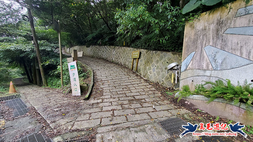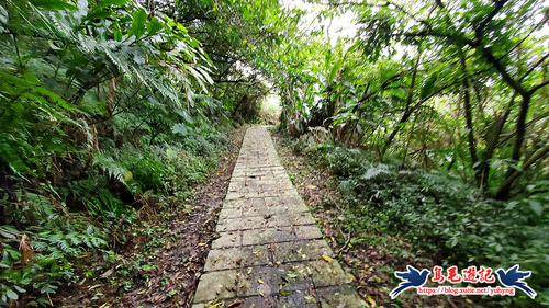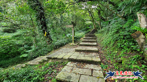 步道口寬大花崗石鋪面步道緩坡上,過彎後石階上爬遇叉路(直行是支線),右轉往椿萱農場。