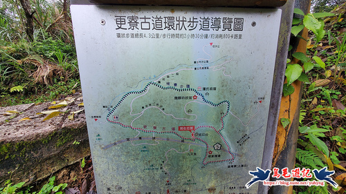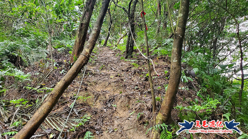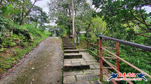 陡下後橫向有荒廢產道往舊庄路二段200巷接荖寮古道,續直行拉繩上爬可往三層崎、畚箕湖山。