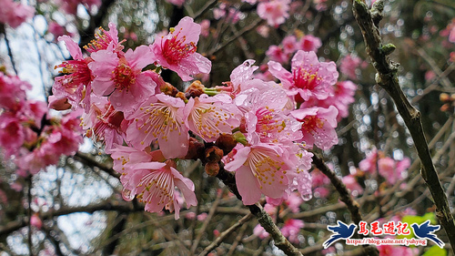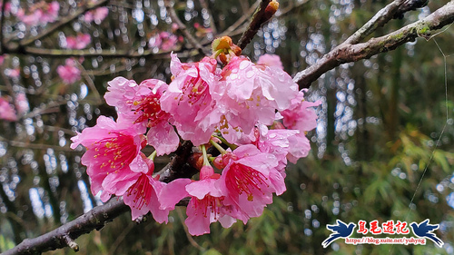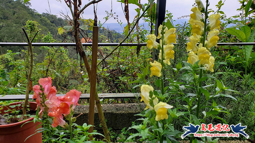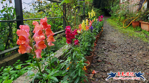 細雨之中,笑看山櫻花嫣紅點綴山坡,頗有幾許春色,農場前一串紅草花盛開,花色有紅、粉紅、紫、黃等,再往前是三代牆,