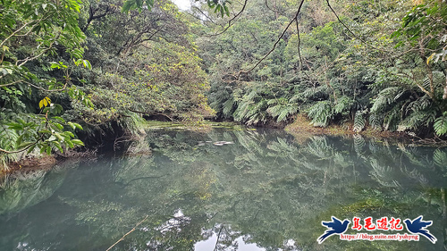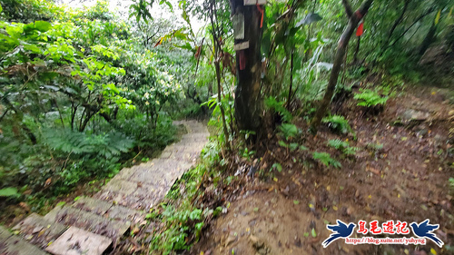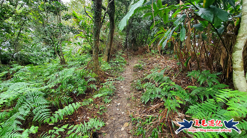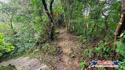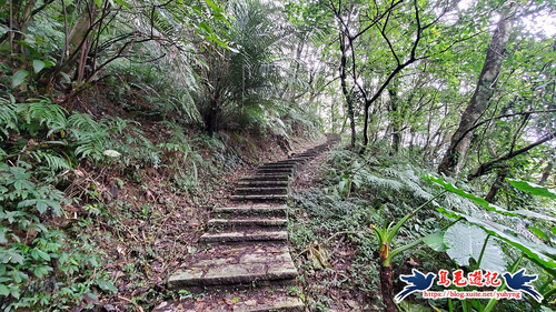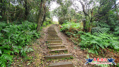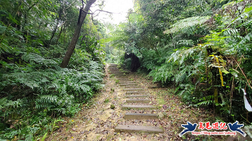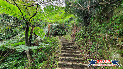 繞過椿萱農場生態池塘之後,開始正式踏上更寮步道石階,一路陡上坡,山坡間蛇木(筆筒樹)及蕨類植物生長茂盛。