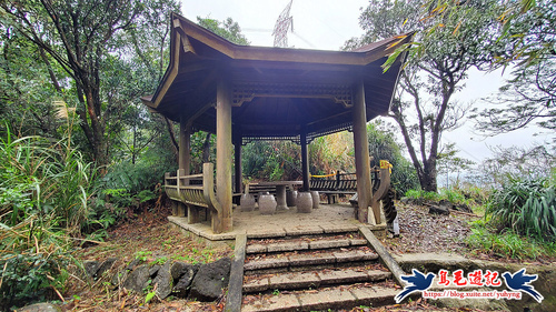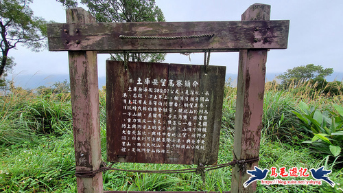 涼亭旁有深坑鄉公所設置木製告示板記載土庫岳望高寮簡介:「土庫岳海拔389.07公尺,是深坑、南港、石碇、汐止界山....」,
