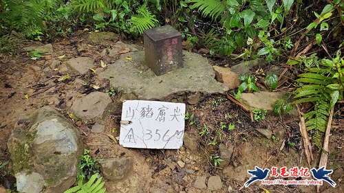 山豬窟尖海拔356公尺,三角點位於電塔內的草叢之間,地上有北市四等三角點基石1顆,四周草木遮掩無展望,見路況不錯,