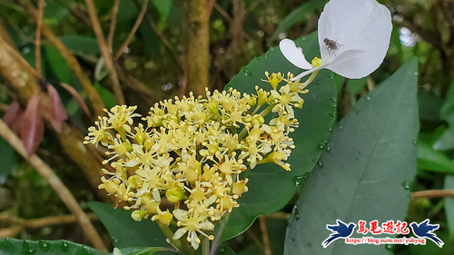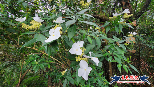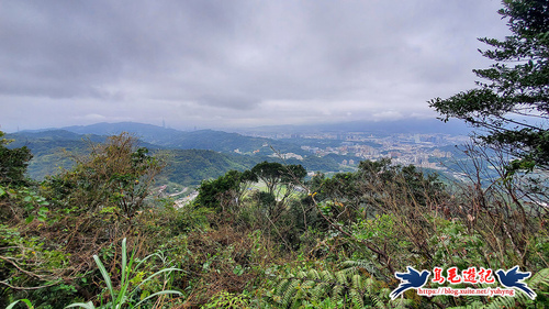 山豬窟尖西南峰上華八仙綻放,白色花瓣如蝴蝶飛舞。此處稍歇,站立大石上展望不錯,可俯瞰南港、松山一帶城鎮風光,