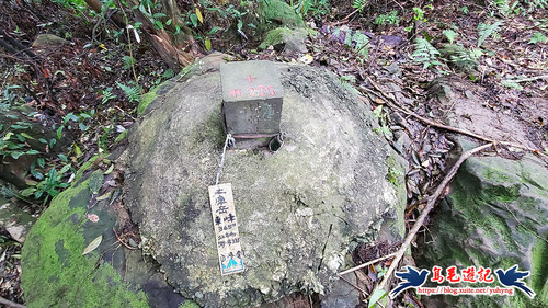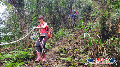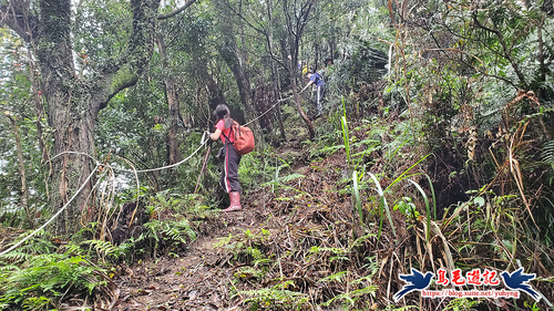 路徑清理過好走,穿越山林投區有架繩確保,不久便抵土庫岳東峰(H365M/市335精幹點),惜位於林間無展望,前行陡下坡...