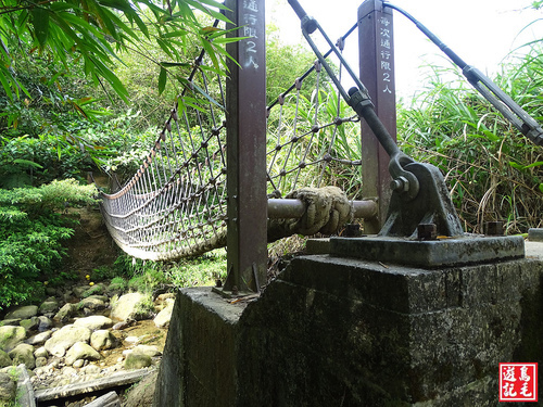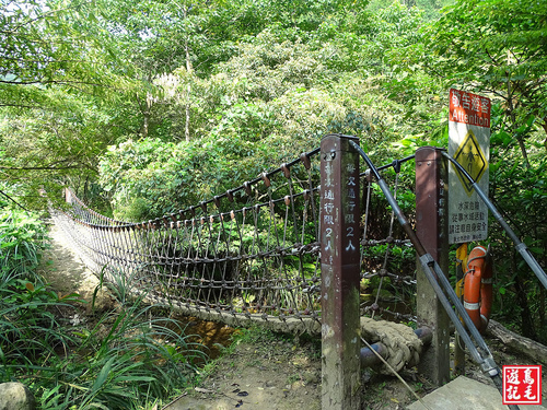 往前不久,就來到第二座繩橋,過橋後可見橋頭旁有左叉路往五分寮山,也是近日由基隆市暖曦生態協會重新整理砍通的路線,