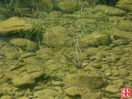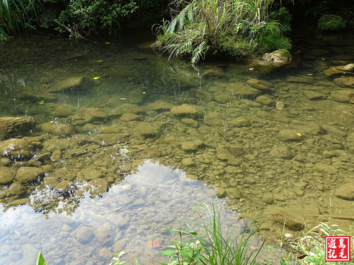 靠近溪畔,藍天白雲倒映水面,見水質清澈,水中魚群悠游。