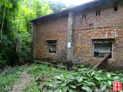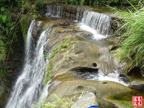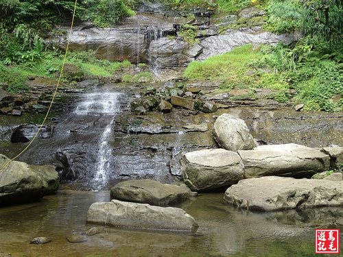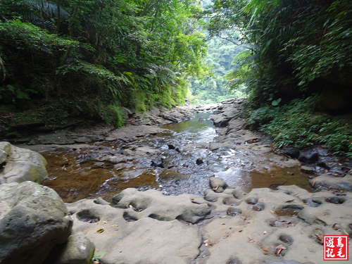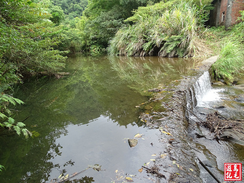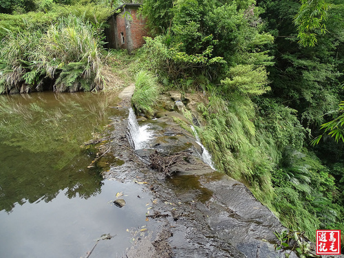 因今日瀑頂水量不大、水位不高,加上穿長筒雨鞋,便直接從瀑頂過溪,再從廢棄磚房角落出來,經私人綠竹林後接回主線,