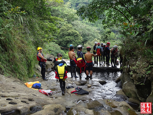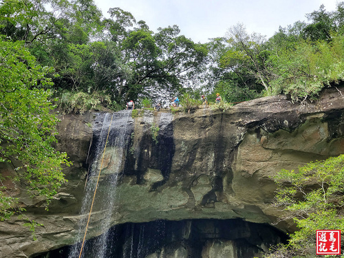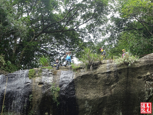爬往瀑頂叉路,往右可續接中坑步道出侯硐,走到枇杷洞瀑布頂端,看見10幾個身著特殊裝備人士站立瀑頂,有教練指導解說,