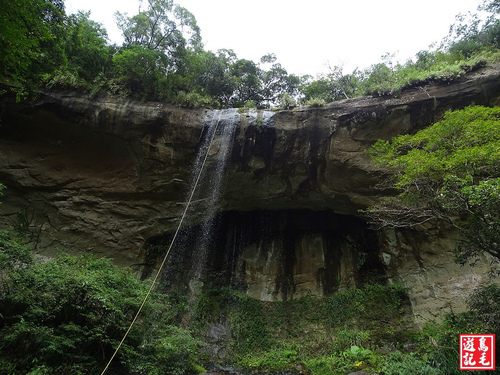 今日來到三貂嶺步道第三座瀑布-枇杷洞瀑布,水量也是很小很小,乍見一條黃色繩索自瀑頂垂下,抬頭望見多人佇立瀑頂,