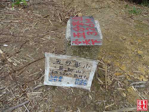 自五分寮山叉路口進入約走15分鐘,已到達五分寮山山頂,地上有土地調查局圖根點基石一顆,海拔標高326公尺。