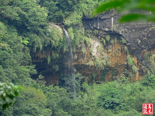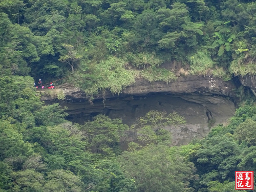 再往前下坡經過觀瀑點,可同時遠望上、下二層的枇杷洞及摩天瀑布,尚可看到剛才那票攀岩垂降好手,還在枇杷洞瀑頂忙著,