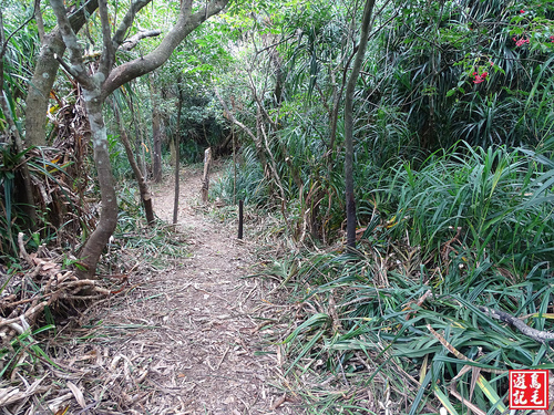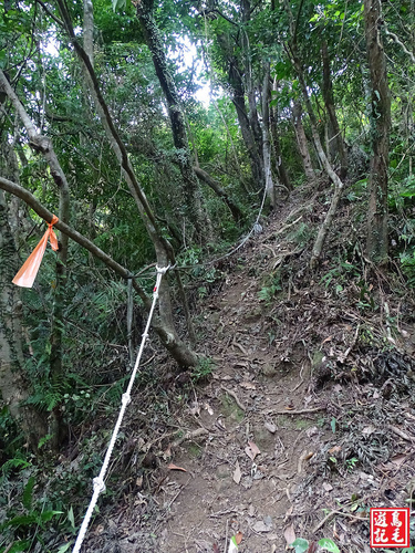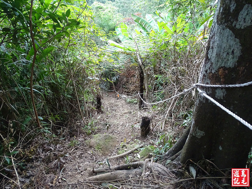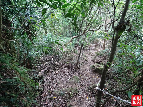 通過林投樹區,也砍得很可以,陡下路段多處架有繩索輔助,途中有叉路一分為二(右下為腰繞路),從左路直下續二路會合。
